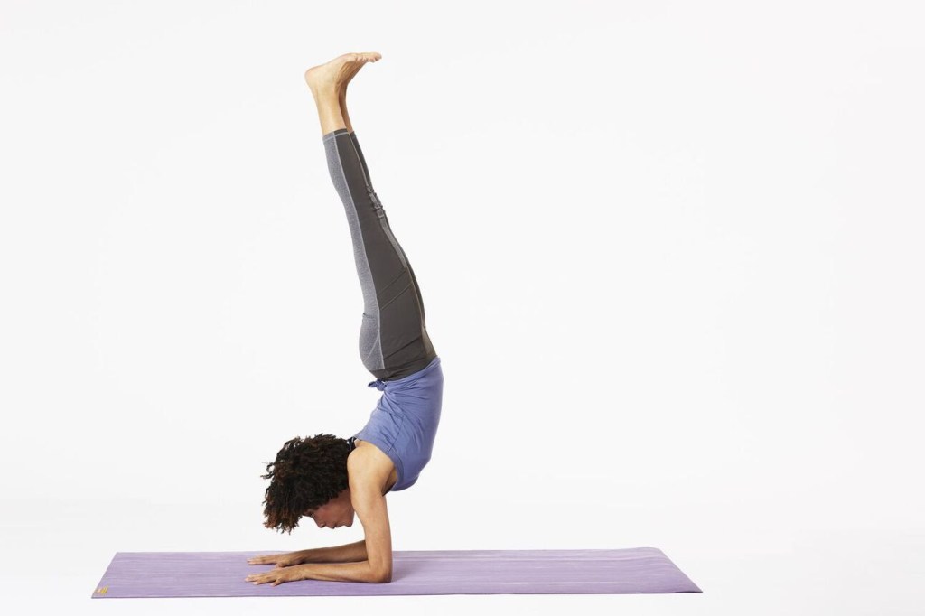 | Elbow stand, or sayanasana in Sanskrit, is an advanced balancing inversion. From peacock pose, the yogi lifts their hands to balance on the elbows. The pose strengthens the arms and core and energizes the mind. |