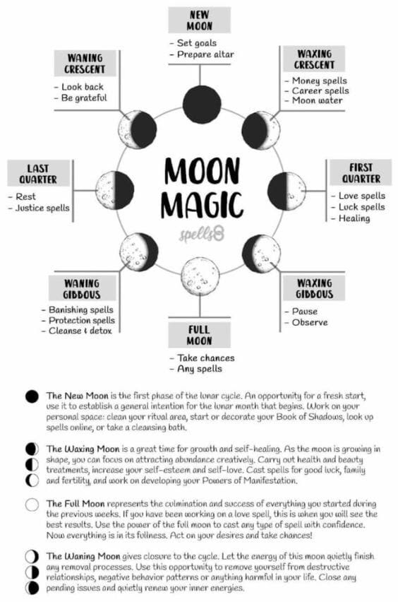 The moon’s phases are often used to symbolize stages of growth and the process of manifesting desires, particularly in spiritual or mystical practices.
