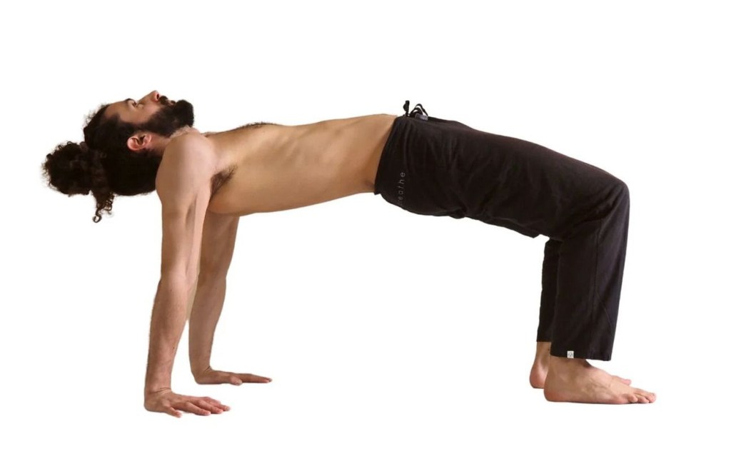 Crab pose, also known as reverse table top and ardha purvottanasana in Sanskrit, is a mild beginner’s backbend that strengthens the arms and improves posture. With the hands aligned under the shoulders and feet under the knees, the yogi uses strength to keep their front body lifted toward the sky.