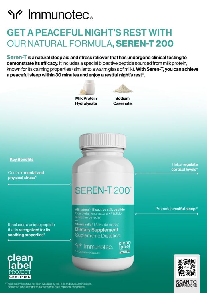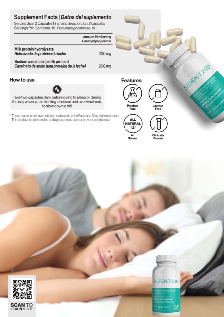Well, I’ve been on a quest for a little more zen and a little more ZZZ’s, and I stumbled upon something interesting: Seren-T 200 from Immunotec. And guess what? It’s got stuff from milk in it! Like, remember when your mom gave you warm milk to help you sleep? Apparently, there’s some science to that!