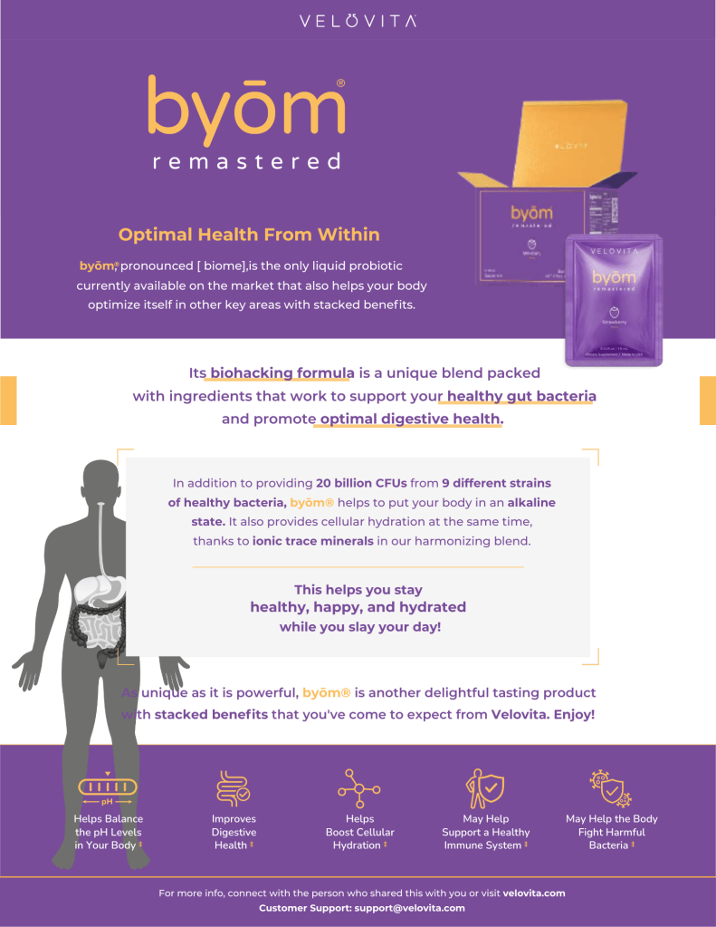 Why say yes: Health starts in the gut. byōm® is a liquid probiotic that helps your body stay in an alkaline state while supporting a healthy microbiome.