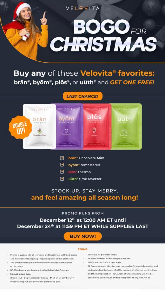 From now until December 24th, 2024 at 11:59 PM ET, you can take advantage of the BOGO for Christmas Promo. When you buy any of the Velovita favorites—brān®, byōm®, plôs®, or uüth®—you get one for FREE!