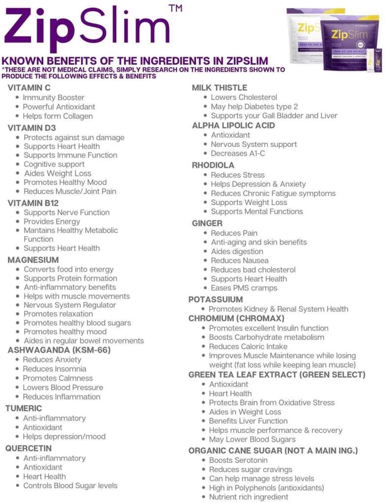 These are the benefits of the ingredients in Zipslim. These are not medical claims, but the ingredient benefits that anyone can commonly find on the internet doing their own research.