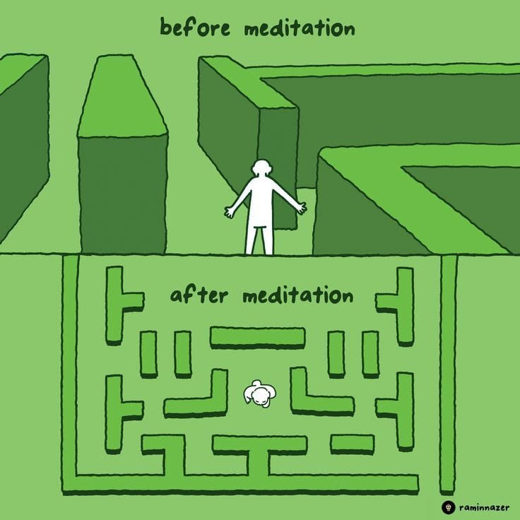 Check out this hilarious (and SO relatable) pic by Ramin Nazer! Ever feel like the “before meditation” dude? Arms flailing, totally lost in the mental hedge maze? 🙋♀️🙋♂️ We’ve all been there!
